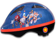 And...right at the same time/on cue there comes "Universal UK" Sonic Bike helmet for kids. It's a kids sizes only helmet where the shell over the foam is blue plastic. It has all CG Sonic, Knuckles & Tails in 'jumping forward' poses, among neat gold CG rings. The helmet has a red border and....there's even a star-bumper detail applied to the black foam underside. What a fun, extra touch to make it even more Sonic-like. This is a good helmet.