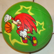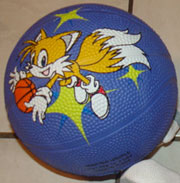 Here are some fun mini basketballs. They're textured like regular balls, but they're all only about 5 inches in diameter. Each mini play ball has one of the newer 2011 character stock arts and a shape for the background. Amy has hearts, Knuckles twisty stars & Tails with sparkles. The art has also had a basketball picture added so it looks like the character is interacting with it. (except Knuckles, who just seems to be jumping past it) Where is the Sonic themed ball? If you have a photo, send it in for credit! You can see the copyright info at the bottom, but what does it say? Where can you buy these?