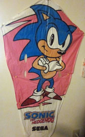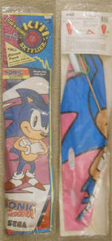 Here is another Sonic themed kite. It's different from the previous kite, and is about 4 feet long when you open it out. It's by "SkyFlier" & comes with a reel of nylon cord. The package says "Flies within seconds". (if you know what you're doing) This is a Diamond Style kite.This was also made in 1992, (like the other kite) & is also rather rare. Plastic kites like this can be damaged in falls/flying & are also large/harder to store.