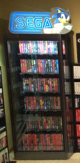In the gallary you can see a picture of something that looks like a variation of this white Sega & running Sonic light up sign. This one though, appears to have a gray or clear background plastic, rather than the white. The blue lines are meant to give a 'neon' effect. With it sitting atop this official etched glass Sega display case (See the logo there?) full of Genesis games, it gives you a good idea of the size of it.