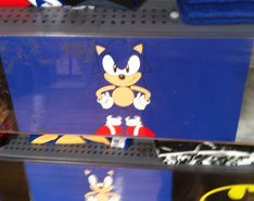 You could see these shelf displays in WalMart in 2012. A set of shelves in the boys/teens shirt area has character tees set up. On the edges of the shelves, plastic borders are set up with cards in them showing the designs you'll find folded underneath. (usually just shirts in a heap, though) Here you can see the 'checker grunge' Sonic white shirt and the classic style forward facing simple Sonic tee. Neither is expensive. (Shirts can be seen in the clothing pages)