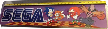 This lights up (here, it is seen plugged in & turned on) It is basically tube shaped. The front has a big 3D Sega logo, with curved back to fit to the rounded sign. There's also a Sega logo raised in the blue plastic on both ends. The front has Sonic, Tails & Knuckles. They're on the usual checkered ground, with a simple blue/gray background. But look at that crazy looking Robotnick there! What's going on with him? He is sort of 'ghostly' in that the image is sort of transparent, his gloves are not attached to any arms, they're sort of just...floating there by Knuckles in a "Scheming Hands" position. Then, he's looking right (instead of left, to menace the heroes) but his eyes are white instead of red. (Clearly they printed in red...Knuckles...) so why the error?