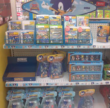 In Toys R Us stores of the UK area, you'll probably find these cool displays in 2011. They're both here to celebrate the 20th Anniversary. The tall one is an aisle end-cap type free-standing one, to showcase only Sonic games, regardless of if they're on sale or not. The second is a special cardboard shelf topper, located above a section of toys and games. You can see a nice range of Jazwares figures from Colors, the 20th Anniversary small figures, and 3.75 line. That empty box would have had their small plush dolls in it. It's great to see stores having a cool effort around this occaision!