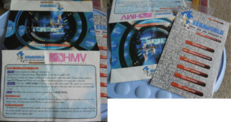 This is a Segaworld London catalog by HMV. At right, you can see the front, back and how to order along with ordering rules & etc. The left shows the actual order form, and the merchandise you could get. Pretty much all of the merchandise has the same image on it: Running stock Sonic and the "Segaworld" logo/word. The colors of the things vary, but they're all pretty generic/similar looking simple branded things. What all can you see here?