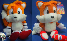 At left, you see the Tomy (Foot-bottom-tag) Tails. He was made in the early 1990s, and is about 13 inches high. As you can see, he has no glove belts, and fuzzy shoes. His bangs are also smooth pieces of felt. He was released alongside the Sonic who also had the tag across the bottom of the foot.