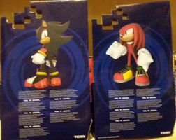 All mysteries about getting them aside...they're on par with the rest of Tomy's items, in that they're a pretty fair plush on the whole. Shadows' ear edges are rather too small & Knuckles' chest crescent mark is way too high and tiny. They also didn't shape Knuckles' body (teardrop is how it should be, the stripe would have worked better had they bothered), however they did bother to give him good and big fists & well as decently sized shoes with all the proper detail. Shadow is ok on the whole, his spikes have the right contour, and you can see his more difficult markings like the red eye edges & leg edge markings. The box sets the shoes up to be hidden though...