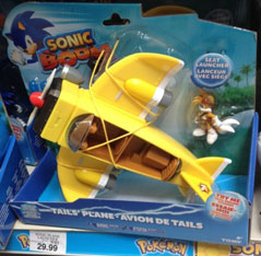 In the gallary you can see what it looks like inside the package. This is "Tails Plane" but it will be labeled as "Sonic Boom Plane Launcher". Remember the photo above, it launches that clear blue energy beam thing (you can see part of it there in the box, there are 2) It comes with the Tails figure you see there (the dot says "With Tails Figure", the other dot says "Seat Launcher"). It's shown here at Toys R Us, and it is 30 dollars for the plane & figure. It seems a little steep for a not-that-big plane with 1 spring-loaded-action feature...but, there it is. Notice how the box doesn't really have a front. The whole toy is pretty much exposed. Is that going to cause a problem with damage, dirt, or collectibility? There is a trigger under the plane that spins the propeller.