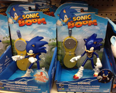 These 2 were spotted at ToyFair 2015. Both feature a 'transportation method' for their feet. Will all characters be released with something like this? Knuckles has sort of rocket (with propellor?) shoe clamps for his shoes, and Sonic is shown on a yellow hoverboard. (Carefully set up to not look like Riders, but to imitate it--accusations of 'cashing in' are thrown around--but really, Riders is old by 2015) These figures are supposed to be larger than the regular line, at 8 inches.