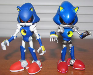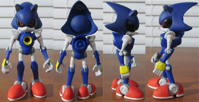 You can find the turnaround of Metal Sonic in the gallary. He looks pretty much like the show, but there are some problems. He has the same articulation as all the other figures (knee joint is fake) but the arms only swivel, because of his shoulder cuffs. They also forgot to paint the engine in the back. All his fingers are fused, and the hand backs are flawed (wiggly rough areas) you can also see really visible seams on his arms (up the center/upper arm) the 'joints' are just painted on dots too, they're not actually detailed in. His nose is also quite blunt/not a pointy cone as it should be.