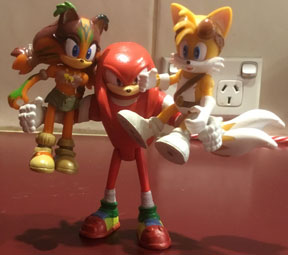 This one is pretty ordinary & show-looking. The goggles seem to have a good amount of detail, as does the belt/shoulder strap. The sports tape paint didn't get on the red part of the shoe & his bracelet seems fine. The tails could use to look a little more dynamic & separate. The back view it almost looks like he only has one tail. The proportions are good, so this figure holds up to Boom collectibility if you like the show.