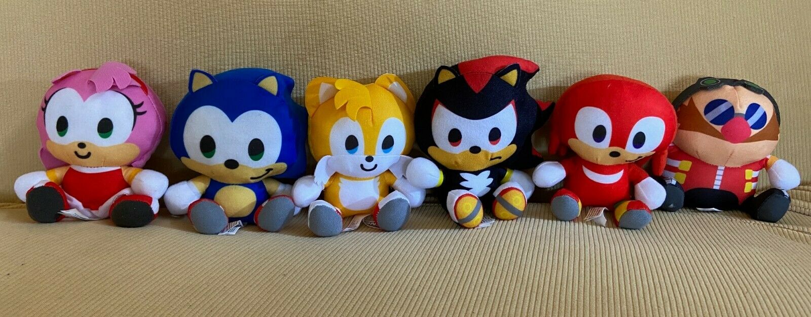 In 2020, they announce these "Little Big Heads" plushes...and they're not so little either! They come in sizes of 6 inch, 9 inch and then Shadow & Sonic also come in a really big 20 inch size. They have large 'chibi style' flatter heads and simple faces like an emoji. The bodies are small, with big feet & hands, and short limbs. These look pretty cute, even annoyed Shadow. The eye color is simplified in a new way, which is as a crescent at the base of the eye color-chip. Remember: Tomy tried to do these but they were all boomstyle and rather costly. Toy Factory plush are always prizes.