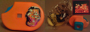 The Tails version of the Carls Jr Slide viewer is srather rare. It has a 'leaning Tails' sticker for the front, & is all blue & orange. You can see the Robotnik one's bag (Sonic branded, with instructions) in the center. The slide (top right) has the same Tails graphic as the sticker, with Sonic in the background.