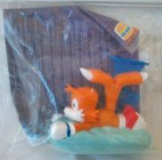 A Kids Meal Burger King assortment. (With back card) If you wind up the Knuckles, he punches his fists. The Sonic and Robo have magnets in them, so when you push the Sonic along, the Robotnick moves away. But what is that purple thing in the background? It's not a cluckoid. It looks like some kind of Proto-Scratch. (From AOSTH, remember?) No one is ever selling 'proto-scratch'. It is actually a target for the Knuckles wind up to knock down. The Tails is a 'pull back n' go' toy, and he came with a "grounder" like target which you don't see here. The larger Eggman one (from the top photo) can be filled with water and pressing the control pad shoots air through the water. This is from England Burger King. Info/Explanations by Ota.