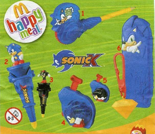 Here is an ad/photo of the selection of toys you could get with a Happy Meal during the Sonic X promotion. You can see the tops (visible up close on another page here of intl' fast food) with their launchers, 1 with Sonic, the other with Shadow. However, what are the other items? #1 looks like some kind of wheel on a stem, 4 and 5 are very similar though 5 looks very small. 6 clearly has a chaos emerald keychain, but what's the larger blue item? These were only released in various areas of Europe, likely most successful in France.
