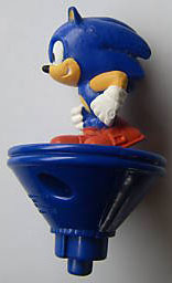 These two fighting tops came from McDonalds Happy Meals in France. You were likely supposed to spin them, and then see which top would knock over the other first. They were fairly creative with their 3D figures on the top, posing them in different ways, however their paint is not so good. Neither one's shoes have any detail, and Sonic's buckles are in the wrong place (directly under his ankles) These had to have come with launchers that would rev-up and release the tops. They're from 2006 and were used to promot Sonic X. Each one is 8cm high.