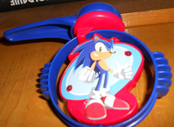 In 2007, Romania also got the "Europe Toys" from the top of the page. The first, at left is an illusion disk. It looks like a frizbee or a UFO, but it actually has mirrors inside that reflect so that a 'hologram like' version of the mini Sonic figure inside is projected slightly above the hole in the middle. (It's a classic Sonic, for some reason) The second item is a Sonic themed 'light spinner' device. That center part with the Sonic graphic has 2 red LEDs & is battery powered. When you push a button, it spins around really quickly and lights up, creating an itneresting 'ring of red light' type effect. With these fan photos, you can see the items from the top of the page up close.