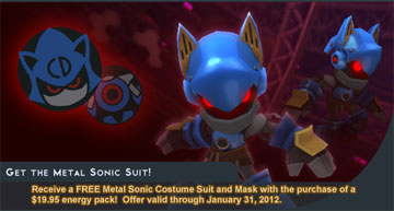 The Metal Sonic suit is pretty cool here. It fits in with the style of the game, while still looking "Metal Sonic Like". The left photo shows the turn-arounds & some close-ups for the textures of it. Why does the one above have green eyes, but all the others with red? You can still likely get the suit with Steam, although the promotion was done in 2012. You have to have also bought Sonic CD's re-release through Steam, to get it, though. This item was a celebration for the addition of Sonic CD to Steam.