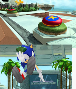 PSO2 continues its tradition of having a Sonic event each year around his birthday. This time, the lobby is more elaboratly Sonic-styled. With more Green Hill palm trees AND the edition of rings (that you can really collect!) along with fun star bumpers to bounce you around.