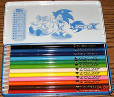 Cool colored pencils set with a Sonic X theme! The tin has most of the cast with a lightening background outside, with Sonic and unusual sitting Tails on the inside. Each pencil also has Sonic's name, and symbol in gold!